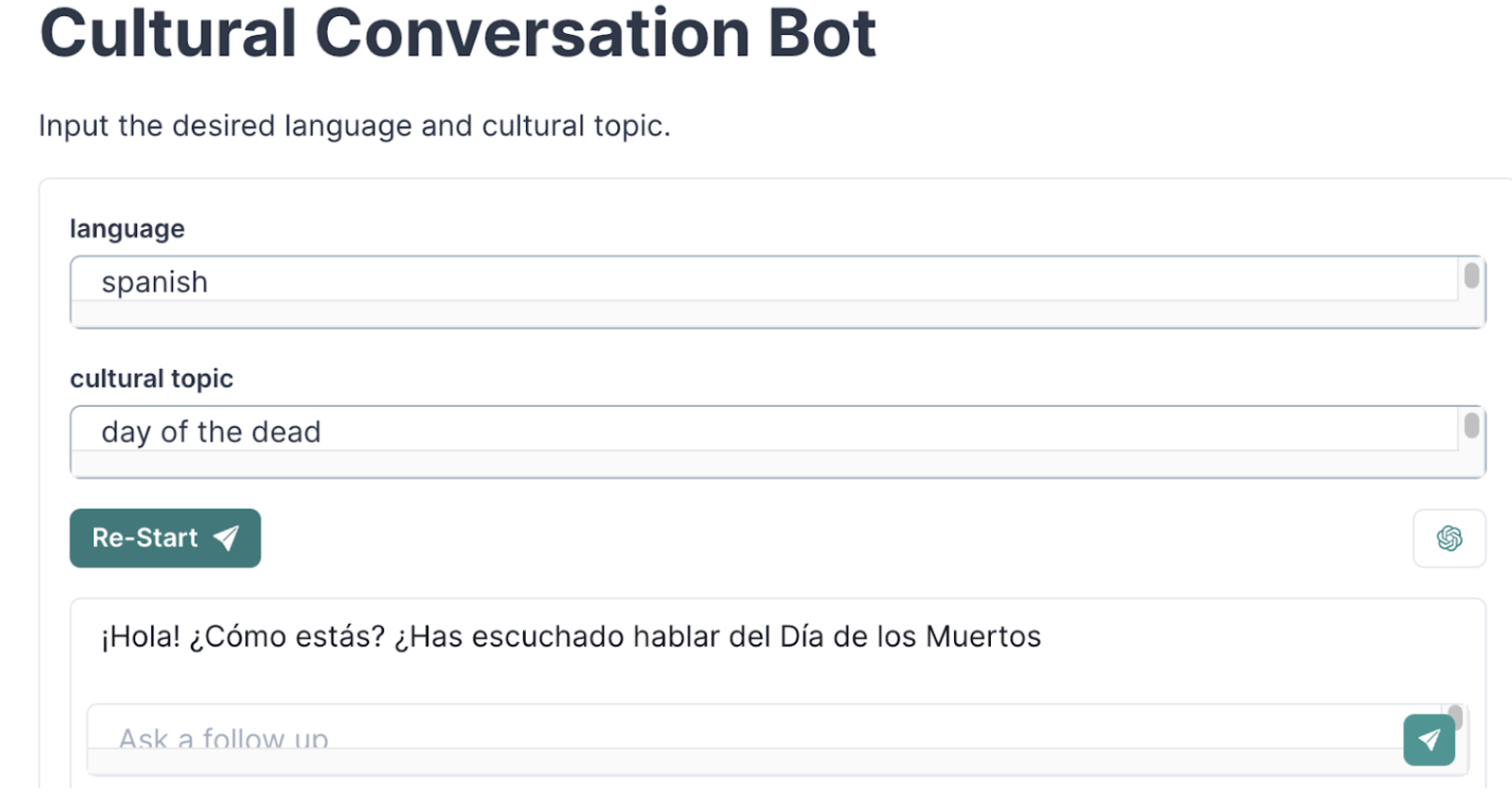 Both of the two previous prompts were quite general and can be applied to subjects outside of language learning. However, the following prompt is more geared towards multilingual conversations. This prompt is a “cultural conversation bot.” It highlights the practical nature of learning about culture in foreign language classrooms by generating a natural, realistic conversation that touches upon a given cultural topic. The conversation is interactive, meaning that students can respond to the chatbot through follow up prompts. So, teachers can assign this tool to students to both improve their cultural knowledge outside of class and strengthen their interpersonal communication skills. Here is the prompt tool. The Lowtech interface seems to generate more natural and interactive conversations, however, so for this prompt in particular, it is recommended to use Lowtech AI instead of ChatGPT. For comparison, the Lowtech outputs are provided below: