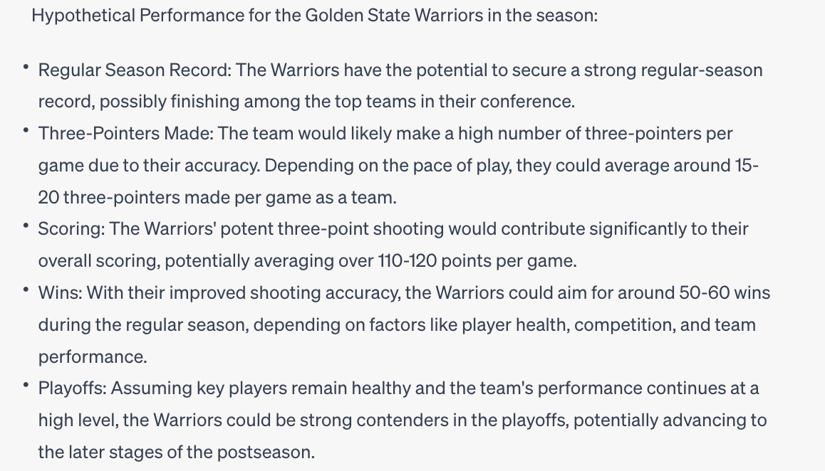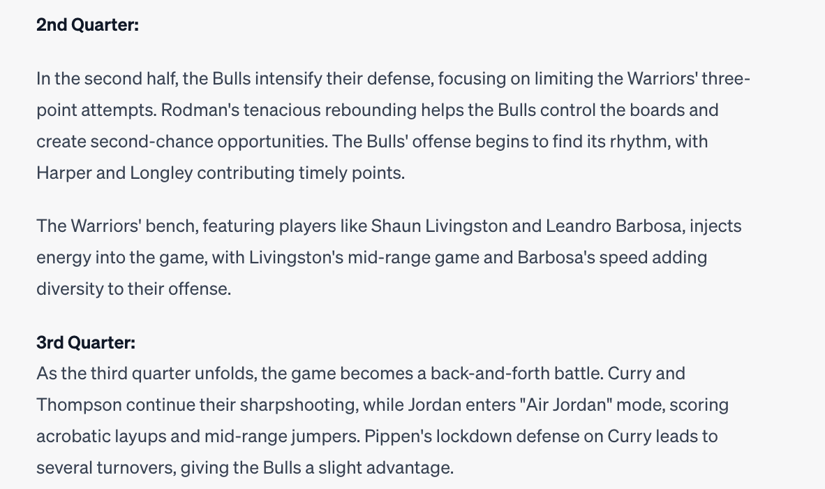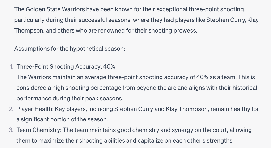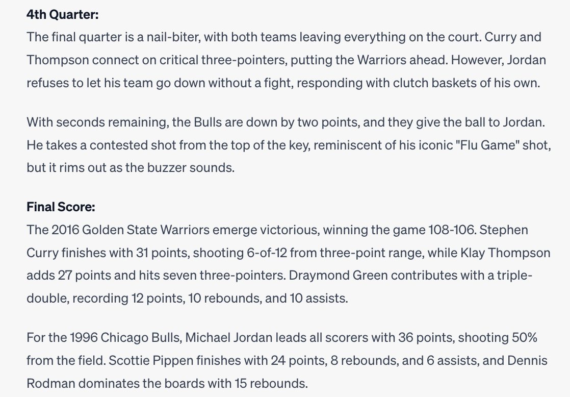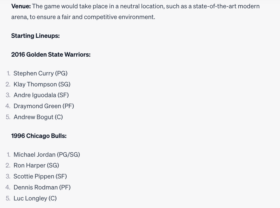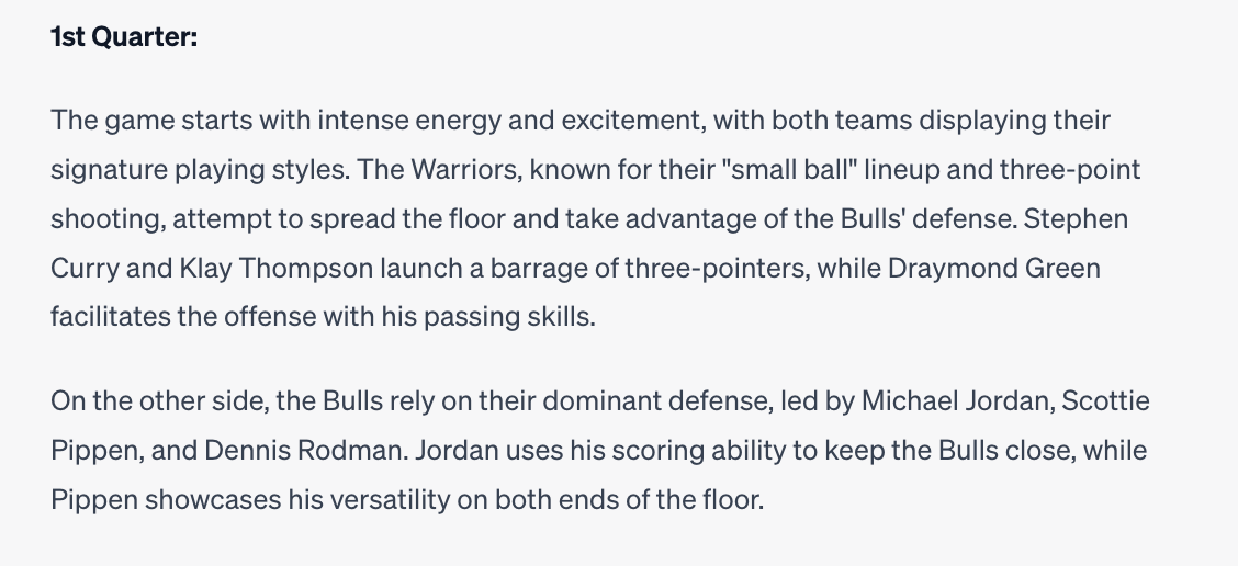 Welcome back to this weekly series on AI. As we advance further in our exploration, we shift our gaze this week to the exhilarating field of sports analysis. In this edition, we will delve into how AI, specifically LLMs, can be employed for insightful basketball analysis and generating hypothetical game predictions. Although LLMs are trained on data up until a certain time (for example, GPT 3.5 is trained up till September 2021 as of now), it can still offer us a treasure trove of insights and predictions based on past data, enabling us to theorize and speculate about a multitude of intriguing scenarios.