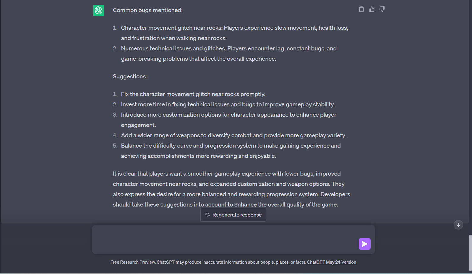 Using OpenAI’s famous chatbot, ChatGPT, we can ask AI to instantly analyze these four reviews and list the pros, cons, suggestions, and common bugs the players mentioned in their reviews. In fact, for the purposes of this small simulation, ChatGPT didn’t even need any instructions whatsoever! Simply pasting the reviews and running was enough information for it to return a list of the common bugs and suggestions present in the reviews.